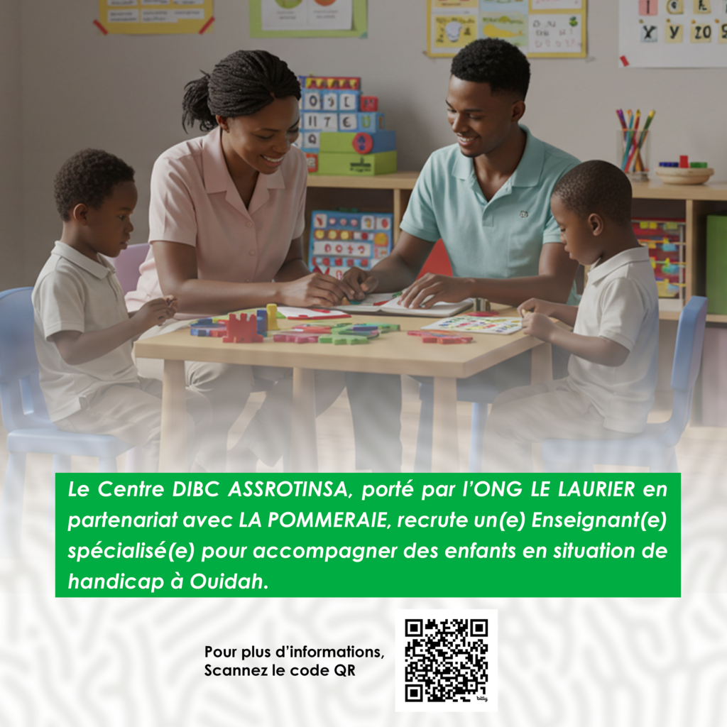 Le Centre DIBC ASSROTINSA, porté par l’ONG LE LAURIER en partenariat avec LA POMMERAIE, recrute un(e) Enseignant(e) spécialisé(e) pour accompagner des enfants en situation de handicap à Ouidah.