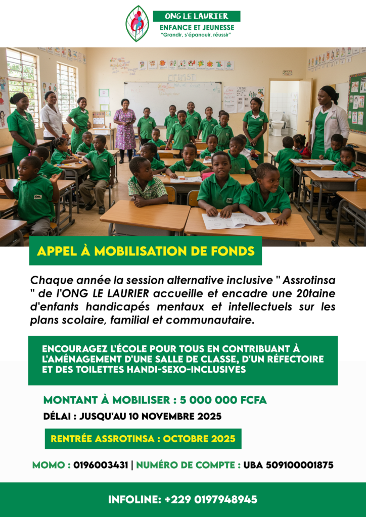 Chaque année la session alternative inclusive  » Assrotinsa  » de l’ONG LE LAURIER accueille et encadre une 20taine d’enfants handicapés mentaux et intellectuels sur les plans scolaire, familial et communautaire.